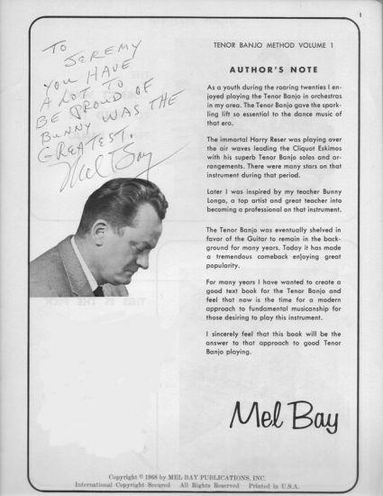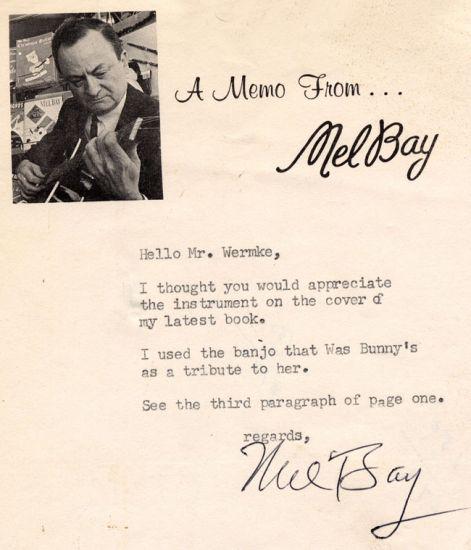 It reads: “Hello Mr. Wermke, I thought you would appreciate the instrument on the cover of my latest book. I used the banjo that was Bunny’s as a tribute to her. See the third paragraph of page one. regards, Mel Bay” - Mel Bay Book Cover