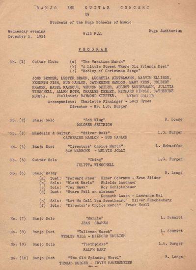 Page 2 of 2: Banjo and Guitar Concert by students of the Hugo Schools of Music on December 5, 1934, at Hugo Auditorium.