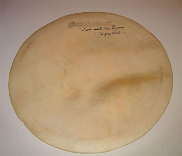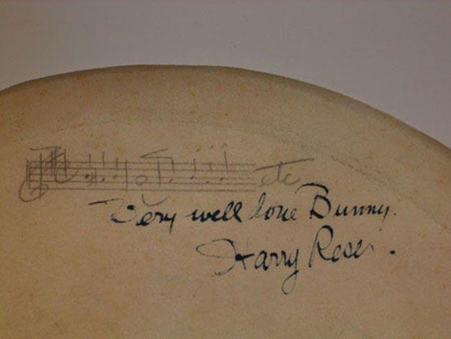 This banjo skin was in Bunny’s personal collection of memorabilia. See next image for closeup of inscription: “Very well done Bunny – Harry Reser”