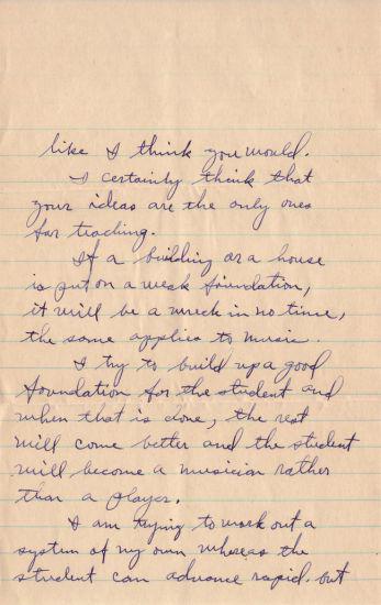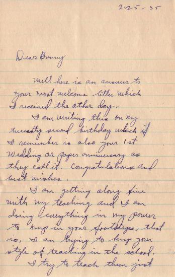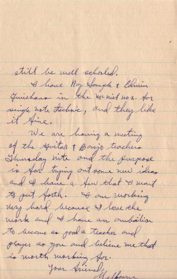 Page 1 of 3: When Bunny gave up teaching, she asked Mel Bay to take over her students. This letter, written on February 25, 1935, mentions her influence on his teaching and also shows that the very young Mel Bay was already building on that and developing his own ideas and methods.