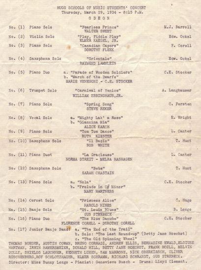 Hugo Schools of Music Students’ Concert on March 29, 1934, at the Odeon Theatre.